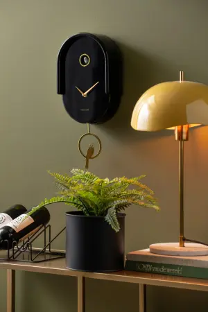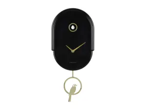 Az óra ingával és elegáns madárdíszítéssel rendelkezik, amely meghatározott időpontokban életre kel. A lekerekített formák és az aranyszínű elemek játékos, mégis stílusos megjelenést kölcsönöznek neki. Egy feltűnő tárgy, amely biztosan elnyeri a dizájn szerelmeseinek tetszését.
